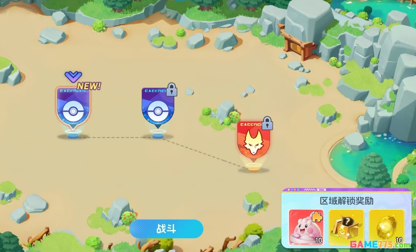 岛屿中的每个地块在初始阶段处于不可开发的阶段,玩家们需按顺序进行区域解锁,才能逐步扩大自己可用的岛屿面积。每个区域在解锁时不光需要玩家们在探险玩法里通关对应的关卡,还需要完成三次解锁战斗,这三次战斗无需一次性打完,若玩家觉得对手难度太高,可在提升宝可梦练度后再来挑战,之前打过的关卡不会重置。完成挑战后,该区域便会变成空地,同时下一区域将会立刻便为可解锁的状态。