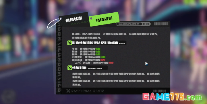 在这个将生命都进行交易的游戏中,情绪在其中自然也是必然数据化的,玩家们每天游玩时都有行动点需求,而打工会消耗玩家们为数不多的行动点,而随着每天多个行动点的打工,打工后玩家们的情绪值都会下降,情绪下降之后,玩家们不仅会受到的伤害增加,所造成的伤害也会一定程度的降低,这也是为什么娱乐场所是非常必要的,在娱乐场所进行游玩之后,玩家们的情绪会得到恢复,甚至部分娱乐场所还可以为玩家们的战斗属性进行加成,而货币、情绪以及行动点这几点都是紧紧相连,密不可分的。