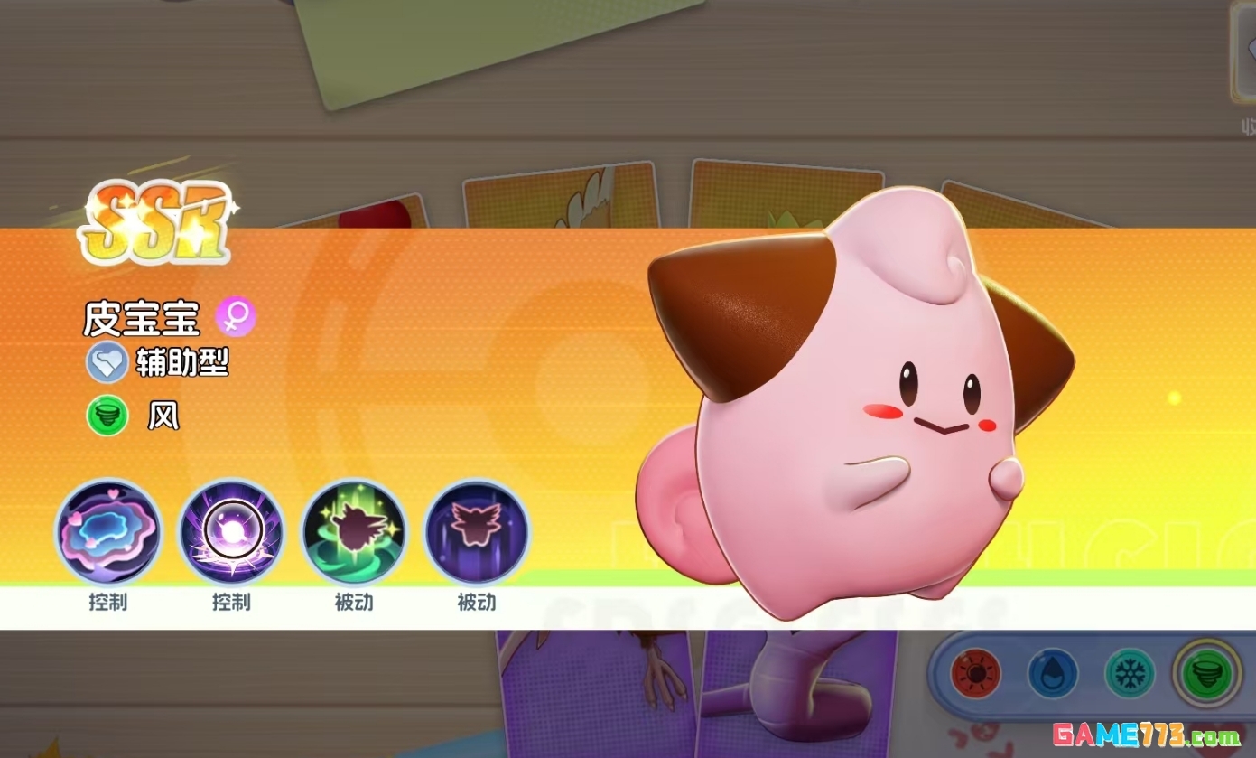 皮宝宝同样是辅助型宝可梦中非常好用的存在,它可主动锁定敌方宝可梦较多的区域释放大招,让大招范围内的敌人陷入着迷状态,配合11级技能月亮之力,能控住敌人非常久的时间。而且皮宝宝每次释放完技能后,还可为全体友方宝可梦回复生命,被动更是能直接无成本的降低敌方闪避数值。