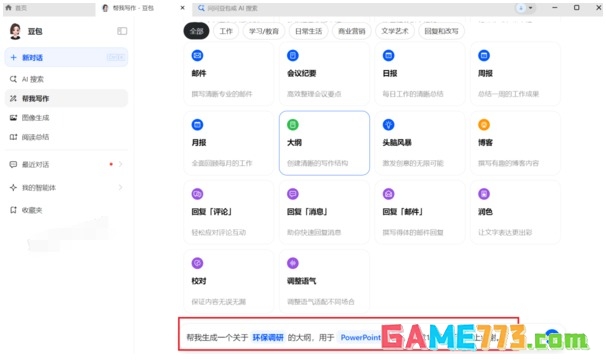3.我们需要在描述模板里,对需要制作的PPT主题进行描述,也可以添加其他的需求。比如我们可以这样写:帮我生成一个关于环保调研的大纲,用于PowerPoint制作,要求10页,后面加上致谢。