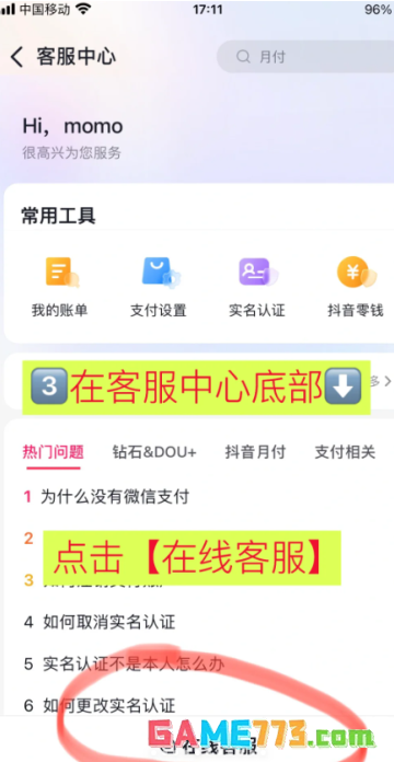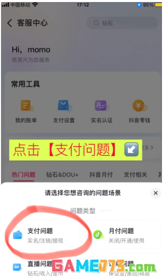 3、客服中心,点击底部【在线客服】,选择要咨询的问题场景,点【支付问题】;