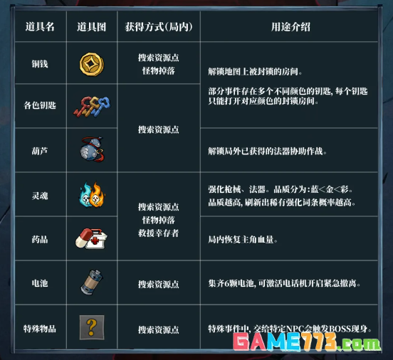 无限轮回任务道具怎么获得?无限轮回任务道具有哪些有什么用?无限轮回游戏中,事件任务道具可通过搜索资源点、怪物掉落获得。锎钱和钥匙用于解锁封锁房间,葫芦可召唤法器助战,灵魂用于强化枪械法器,药品恢复血量,集齐6颗电池可开启紧急撤离,还有特殊物品交给NPC可触发BOSS战!详细的事件道具就跟随小编一起来看看都有什么用吧!