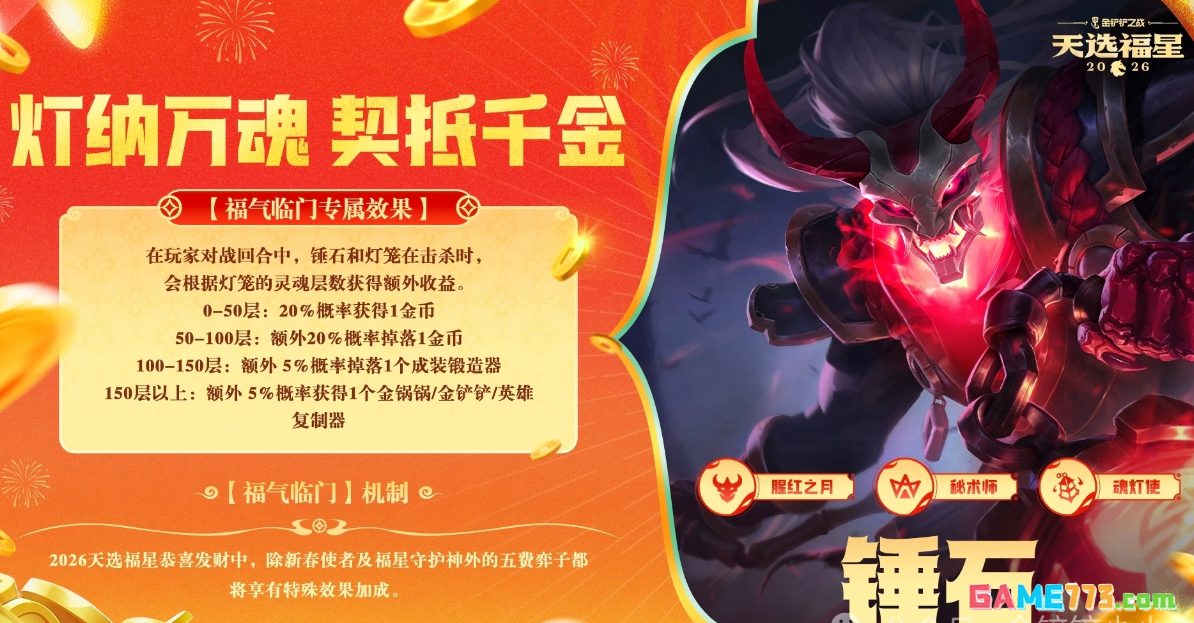 金铲铲之战锤石福气临门效果,金铲铲之战福气临门锤石机制效果!在2026天选福星恭喜发财模式中,五费卡锤石拥有专属福气临门效果。锤石与灯笼击杀的敌人 能不断叠层,每50层就能提高掉落道具的概率,锤石详细的机制就跟随小编一起来看看吧!