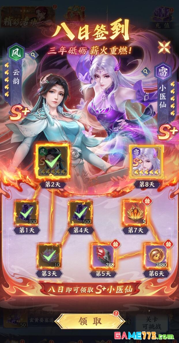 具体签到奖励节奏如下:第1日登录即赠300个紫色材料,可用于技能升级或角色升星;第2日解锁云韵角色卡,直接加入队伍;第3日发放10个升星专用道具,显著缩短主力角色成长周期;第4日再获500个紫色材料,总量达首日近两倍,建议集中用于主C或核心辅助的技能等级提升;第5日提供288个红色材料,适用于高阶装备强化或角色突破;第6日发放2880点核心资源,覆盖前期绝大多数养成消耗;第7日赠送5枚指定等级装备碎片,集齐后可合成完整橙色装备;第8日终极大奖——小医仙正式登场。
