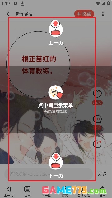 8、调出菜单后,可实现上下话的切换操作,能向作者打赏,可开启自动播放模式,也能切换至夜间观看模式,同时还支持发送弹幕互动。
