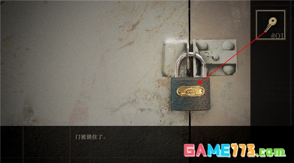 7、向右走到大门处,调查大门,使用钥匙打开门锁。