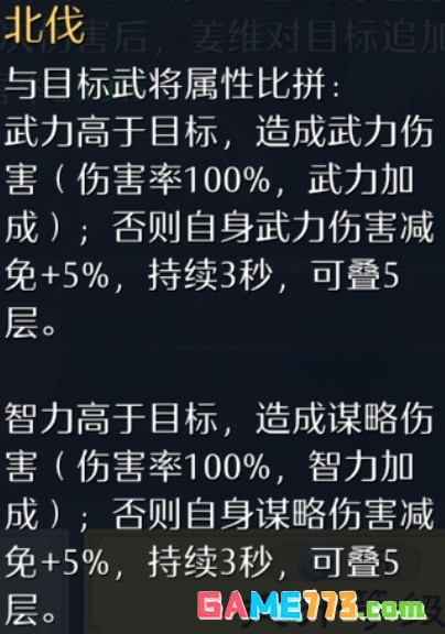 姜维的北伐即便比拼失败依然能叠25%武力和谋略减伤,这是其他辅助所做不到的。