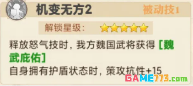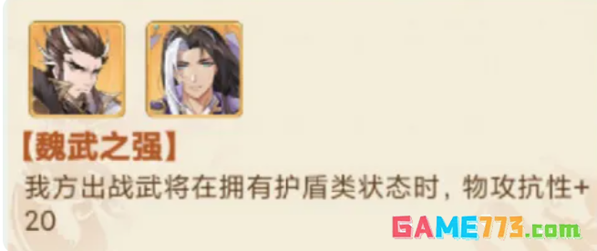此时他只要是拥有护盾保护的话,那么这个状态可以为他带来策攻击抗性的15点增强,所以在对面如果用到策略攻击效果比较多的情况下,我方可以抵抗的数值也比较高,那么这里通过郭嘉跟曹操搭配在一起,他们可以触发的一个连携效果叫做魏武之强。这个能力就是让我方出战武将在拥有了护盾类型的状态时,让物攻的抗性增加10点,效果放在这里的话其实大家就可以发现,魏国里面基本上大家通过连携触发的这一效果当中,大部分都是带有抗性的能力,所以这个阵容是非常有自我生存强度的一个搭配。