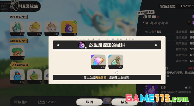 如果其中有一些精灵是大家不需要使用的,就可以选择放生,通过放生之后就可以获取资源。而这些资源在后期就可以带来较好的发展,在放生之后,玩家所获得的资源可以让玩家在后期拥有较好的辅助效果。