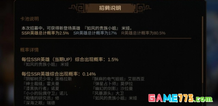 根据官方的卡池介绍,游戏中SSR角色的抽取概率是2.5%,SR角色的概率是17%,R角色的概率是80.5%。这些概率在众多的卡牌手游中是比较常见的,基本符合大多数玩家的预期。但是具体的出货率中有些值得我们注意的地方,尤其是对于up池的SSR角色来说,其综合出货率为1.5%,而每个up池SSR的综合出货率为0.14%。因此,虽然SSR概率很低,但是每次up池中SSR角色出现的几率很小,玩家想抽到自己喜欢的角色需要多次尝试。