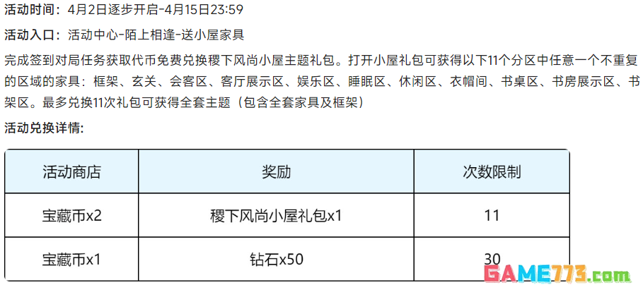 装扮活动:4月2日起,通过签到和对局获取代币,免费兑换“稷下风尚主题礼包”,最多兑换11次可集齐全套家具