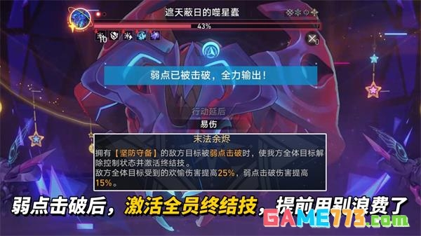 1. 当敌方首领单位被弱点击破,会解除全队控制效果并激活终结技。这主要针对碎星王虫,对局中角色常被其单体攻击控制,但解控仅在破韧时生效,实际对局建议主动带解控型队友,以免影响输出。敌方还有 25%欢愉易伤、15%弱点击破伤害提高,利好绯英、银狼 LV.999、火花、流萤、乱破、波提欧等角色。