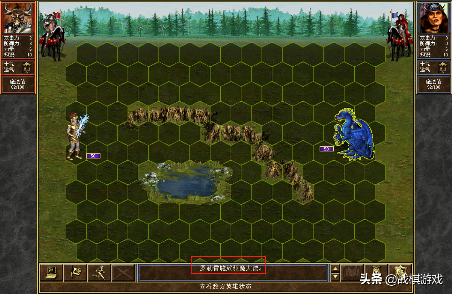 无水系魔法:15MP,可将一部队传送至战场的任一地点,但不能穿过城墙和护城河。