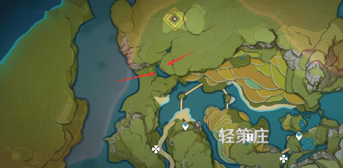 三、村长会让你找另外碎片,分别是岩尊像很多的地方和最高处,岩尊像在轻策庄西边,如下图;