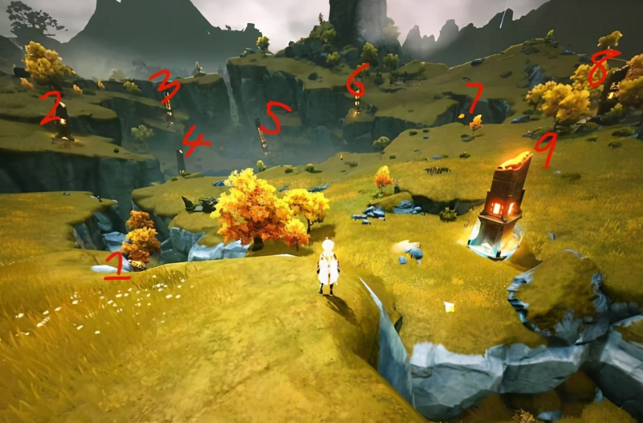 9颗靖世之柱的位置如下,爬上柱子把追叙之石镶嵌进去就算完成一根柱子,镶嵌的顺序没有要求;