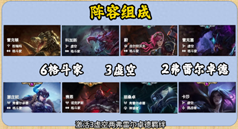 S9新手最稳上分阵容他来了,就是这套:虚空斗士挖掘机,本期小糖一分钟教会你玩这套:虚空斗士挖掘机。阵容组成阵容组成主要由雷克顿、科加斯、蔚、雷克塞、瑟庄妮、塞恩组成6格斗家羁...