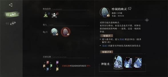 重返未来1999深眠16-1怎么打?深眠16-1中吵闹的幽灵洞悉三,二十级,试图引起注意的幽灵,家具自行移动,水龙头总也关不紧,时钟在错误的时间里鸣响…显然,这是一场团伙作案,其中好孩子技能就是在进入战斗时,进入隐蔽