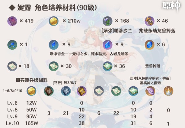 原神妮露的培养材料是什么?妮露是一位非常特殊的水元素功能型角色,她的元素战技可以触发自身的天赋,从而改变元素反应的效果。妮露的元素战技有两种效果,一种是可以施放给敌人施加潮湿效果的净天水环,另一种则是