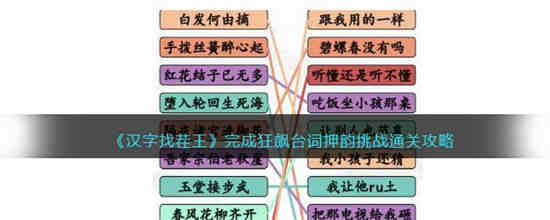 汉字找茬王是一款休闲趣味的文字类解谜游戏,狂飙是现在非常火热的电视剧,很多的小伙伴估计都在痴迷地追剧吧,而完成狂飙台词押韵挑战是游戏中新推出的和狂飙台词有关的谜题,考验着玩家对韵脚的掌握,也是非常有意