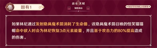 原神林尼固定天赋惊险演出有什么作用?天赋惊险演出触发的首要条件是消耗二段蓄力生命值。如果使用二段蓄力但未消耗生命值,将无法享受基于攻击力的80%提高造成的伤害。简单来说,猫猫帽增加了80%的伤害倍率,即普通攻