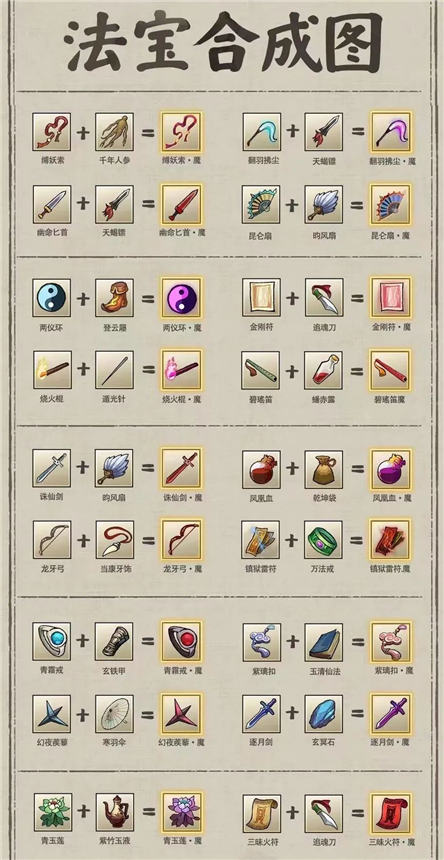 九重试炼这款游戏中全部的武器和法宝都只能通过我们自己去寻找材料合成的,想要更厉害的武器,就需要找齐它所需要的材料,并且以正确的方式进行组合合成哦。但是由于这款游戏的武器和法宝种类也很多,所以大家自己去