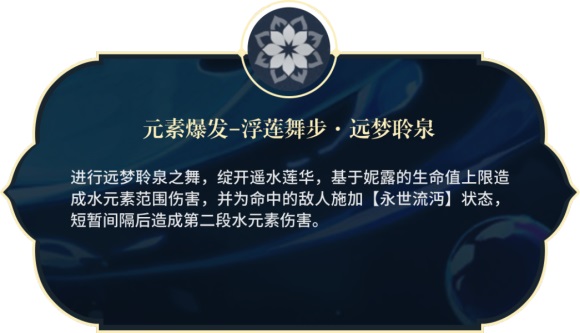 原神妮露元素爆发机制是什么?妮露的元素爆发是进行远梦聆泉之舞,绽开遥水莲华,基于妮露的生命值上限,造成水元素范围伤害,并为命中的敌人施加「永世流沔」状态。短暂间隔后,处于永世流沔状态下的敌人将受到水元