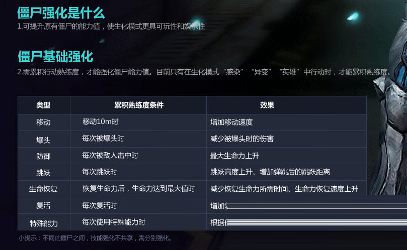 csol新版本僵尸新纪元正式开启,出了新武器之外,新版本上线了僵尸进化系统玩法,游戏中的僵尸技能属性全面升级,下边我将为您详细介绍这一新玩法!csol僵尸强化是什么?僵尸强化是指可对原有僵尸提升能力值!根据玩家累积的行动熟练度提升僵尸能力值,使僵尸进化,进化后能力等级将会被重置。但却可以获得全新的僵尸形象以及更为强大的能力。僵尸全面强化,基础属