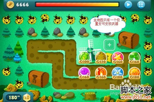 下面我针对有些网友的提问,来作下具体的经验分享。首先,本关的全地图只有一个位置可以安放武器。建议是选择太阳,原因相信大家知道,就是攻击范围大,可以很快的清理道具腾出空的位置。 我这里将风车设置为了进攻的目标,为的就是尽快的打出空位利用太阳很轻松的即可清理周边的道具,如图,我随到的武器是有一个太阳和火箭。还是继续以风车为目标,攻击即可