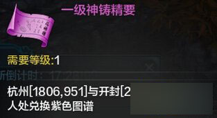 天刀游戏目前新出了个神秘商人,玩家可以在他那儿购买一级神铸精要,然后去兑换铸神谱,那么在哪兑换呢?一起来看看吧。先来介绍一下神秘商人的位置,杭州和开封都有,杭州的位置是(1805,950),开封是(2699,890),去这两个地方都可以买哈,买了之后直接在他这兑换一级铸神谱即可,精要和铸神谱的兑换比例是6比1,也就是说6张换一本,有了兵器谱就可以自行打造兵器