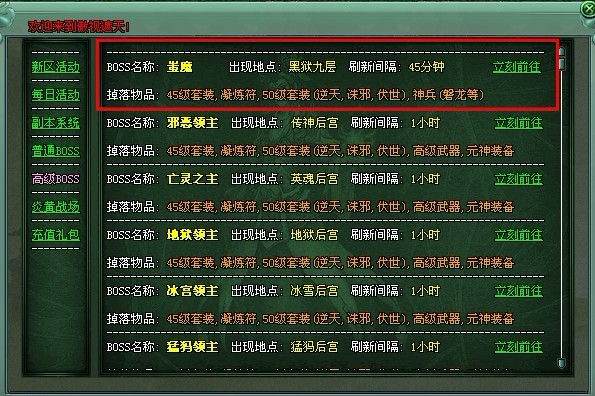 傲视遮天里想要击杀BOSS获得高级武器有两个选择,一个是迷失战神,一个是黑狱9层的蚩魔。迷失战神已经介绍过,这么不多说了。说说蚩魔。 蚩魔隐藏在黑狱最高层9层,45分钟刷新一次,会爆出各种武器,从40级武器到55级武器都有,还能爆一些元神装备,据说有玩家在杀死蚩魔之后爆了一个鸿天混元盔,那可是神级头盔啊,可见蚩魔是绝对的深不可测,什么好东西都能