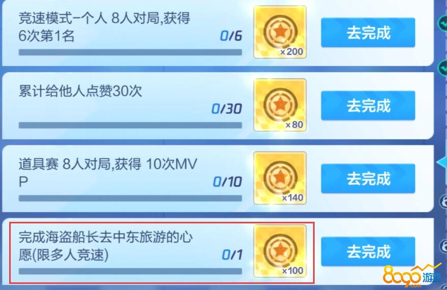 跑跑卡丁车手游在第五周的挑战任务中有一个完成海盗船长去中东旅游的心愿的挑战任务,那么怎么完成海盗船长去中东旅游的心愿呢?别着急,下面我就为玩家们带来挑战任务攻略。 大家还记得在第一周挑战任务中那个完成黑妞看熊猫的任务吧,而完成海盗船长去中东旅游的心愿这个任务完成的方式和黑妞的那个任务完成的方式几乎是差不多的。首先玩家需要拥有海盗船
