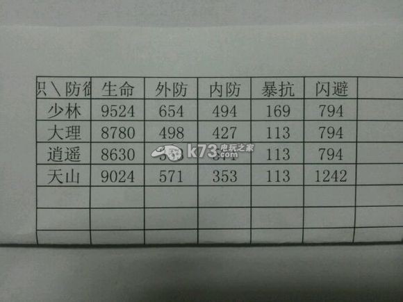 天龙八部3D是一款最近新出的网络游戏。游戏的人物角色相信大家都很了解。那么,对于四支门派了?我给大家带来的是天龙八部3D四支门派的属性成长介绍。首先,我们知道共有四个门派!大理,逍遥,少林,天山。先说装备防御类的:血量,外防,内防,暴抗,闪避这五个属性!上图数据全部来自于60级各门派橙色衣服和靴子的真实数据!于是得出下面的数据图由此可以看出少林