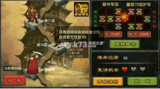 七雄争霸这款游戏中的千重楼是很多玩家都在挑战的。很多玩家说69层不好过,我给大家带来的就是七雄争霸千重楼第69层通关布阵一览。七雄争霸手游千重楼69层通关布阵:注:图片为69层通关后图片,布阵不变。英雄阵容:四君子加管仲。我方战力为13187,敌方战力为12045。采用锋矢阵,第一行布枪,第二行分别布弓、策、盾,第三行布剑。上面的文章就是七雄争霸千重楼第69