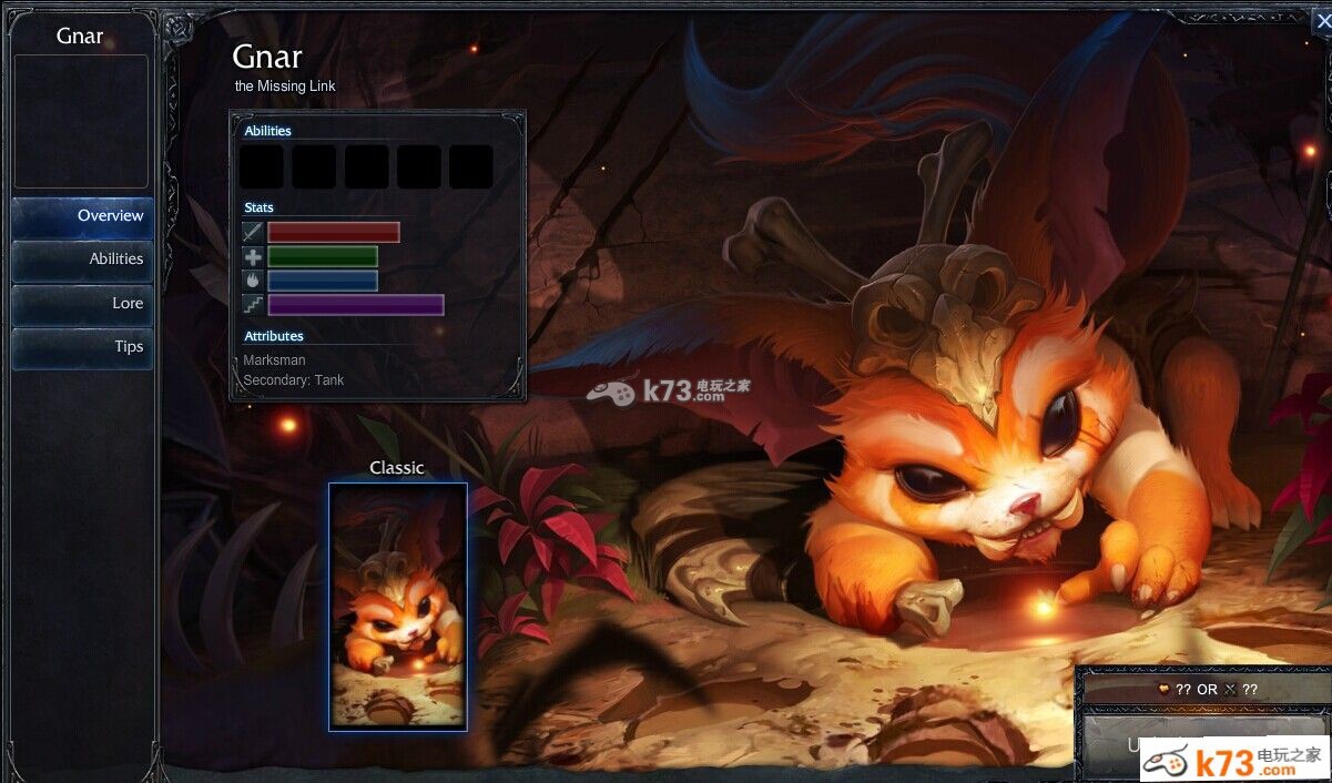 等了这么久,拳头公司终于要推出英雄联盟下一位新英雄啦!没错,就是萌货Gnar,这个新英雄可攻可受,有时萌,遇到危险的时候也能变身猛兽,是不是很期待呢?下面就让我给大家介绍一下吧!Gnar这个英雄,感觉上单比较合适,打野应该也不错,有位移 有加速 有减速,有突进 变身后 WR 2个眩晕 Q减速…… 不过 打野要对被动怒气条把握非常好