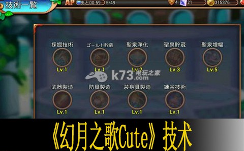 幻月之歌Cute日版中虽然有些描述大概能懂,但是一般玩家玩起来还是很麻烦的,这里带来技术界面翻译。第一个是领土里面金矿的开采技术,技术越高,每次采的金币越多,用处不大。第二个是金币的最大贮藏量,第三个升级是增加圣泉产出物品种类,第四个圣泉的贮藏量。第四个是武器制造的技术,升级能出现新的武器制造后面同理。以上是幻月之歌Cute技术界面翻译的内容