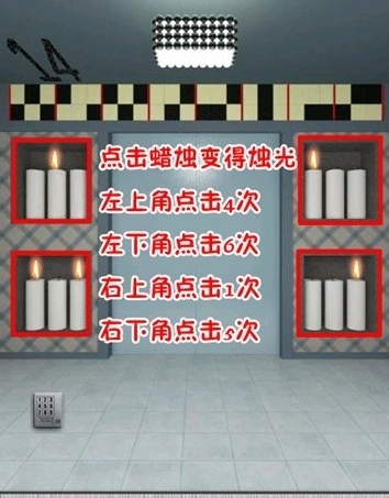 史上最难破解的100道门第七十关玩法攻略,这一关说真的,不看攻略想过关的难度还是比较大的。操作的步骤有点多,而且挺繁琐的。建议照着攻略来操作。根据大门左上角的黑白方框所提示,点击左上角的蜡烛4次,左下角的的蜡烛6次,右上角的蜡烛1次,右下角的蜡烛5次即可,接着会出现数字:14。接着,我们再次点击左上角的蜡烛2次,左下角的蜡烛6次,右上角的蜡烛4次
