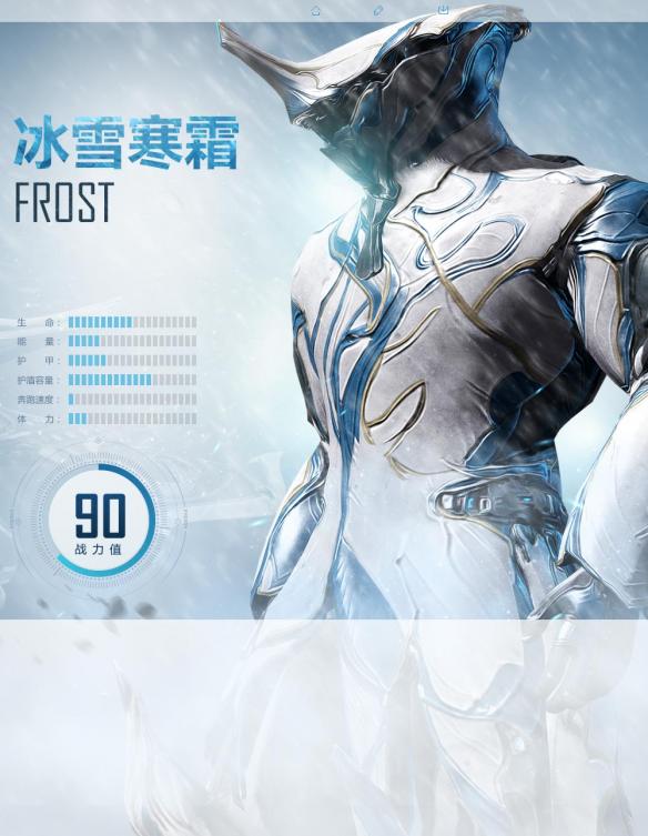 冰雪寒霜战甲的英文名是Frost,他是一个以冰霜为主题的战甲。尽管Frost给人以慢速、重装甲的印象,但他却攻守兼备,既能操纵暴风雪打击、冻结敌人,也可以创造冰霜护罩,保护队友免受伤害。