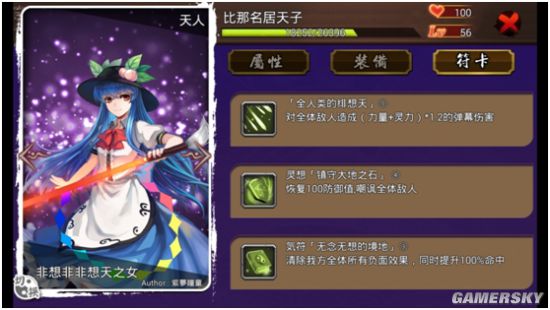 比那名居天子角色名:比那名居天子战力:145简介:天子的在生命、防御方面拥有极强的基础属性,相应也有较弱的力量和灵力属性,同时还有低到令人发指的闪避(和芙兰一样,0)。出击消耗12信仰5饭团,属于正常主力水平。定位是纯粹的防御向角色,即使拿来当队长也是一个单纯的肉盾,并不能指望天子输出。推荐位置:防御位攻击符:全人类的绯想天⑤35级觉醒,对全