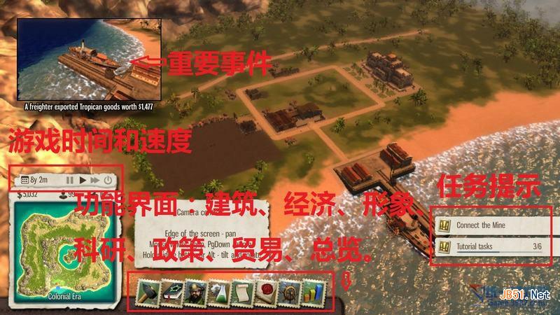 第二章:界面详解 主界面 主界面包含了游戏的所有操作分类。 如图所示,包含了从建筑到贸易的各项功能。 对海岛城市的建造也是在主界面完成。 在遇到重要任务时还会有提示。 会在中心区域以对话框形式弹出。 玩家可以对任务和事件进行选择。 1、建筑界面 基础设施: 城市的基础建筑,发展的根基。 包含各种电力能源工厂。