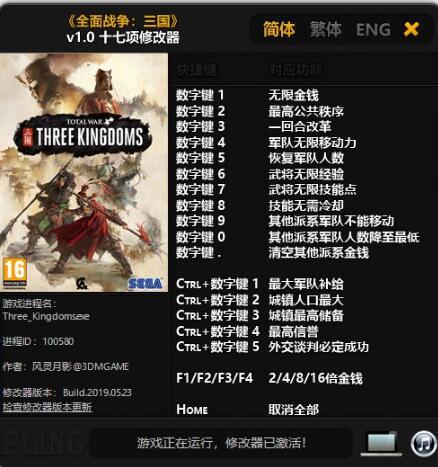 三国全面战争作为一款既有内政又有即时战斗的策略游戏,游玩难度还是非常高的,很多时候都会遭遇资源不足的情况下,于是我带来了三国全面战争十七项修改器及使用方法,感兴趣的赶快来看看吧。对应游戏版本:v1.0 如无意外全部或部分功能也会支持其他后续版本。基本功能:点击简体、繁体、English,可以切换语言 (切换语言后修改器将把该语言设置为默认语言)点击音
