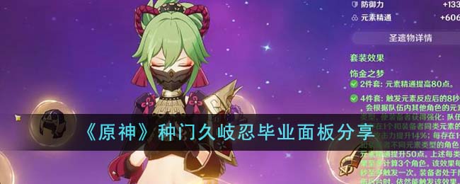 原神种门久岐忍毕业面板是多少?在原神游戏中久岐忍是一位四星雷系角色,但是很多玩家不知道久岐忍的毕业面板是多少,根据不同的武器和圣遗物毕业面板也会稍有不同,更多详细内容在这篇久岐忍毕业面板介绍中,让我们一起来看看吧。原神种门久岐忍毕业面板分享 " >原神种门久岐忍毕业面板分享1、西福斯的月光+饰金四件套攻击力:1100+生命值:2.7W+元素精通:780+E技