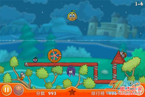 第6关:将橙子砸在轮子的右上方,使轮子向左滚动并碰到炸 药即可。从动物和植物等隐藏处拿到所有的星星即可三星。第7关:使轮子砸在上面木棍的右端滚下,且滚下后,先碰到左边的橙子再碰到右边的橙子即可。从动物和植物等隐藏处拿到所有的星星即可三星。第8关:先让橙子从上面的木棍出滚下,然后再掌握好节奏,将第二个橙子砸在可以转动的木棍右端,使两个橙子