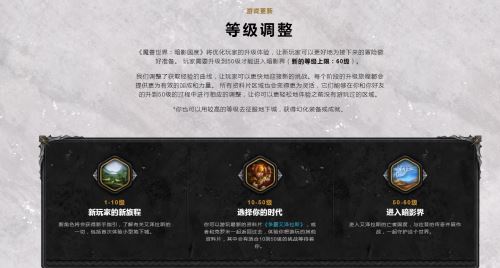 魔兽世界最新版本的9.0暗影国度公布了,很多玩家都很期待这个新版本的到来,也公布了暗影国度的等级升级路线,下面就来为小伙伴们详细的介绍一下。暗影国度1-60升级路线介绍:1- 10 级(新玩家的旅程)新角色将会获得新手指引,了解有关艾泽拉斯的一切,包括首次体验小型地下城。根据魔兽世界团队在嘉年华座谈会栏目中的说法,1- 10 级的玩家们将在一片名为&ldqu