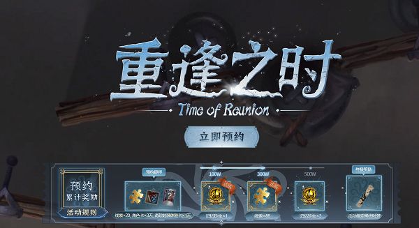 第五人格重逢之时官网预约活动中有很多的奖励,至于预约的方法其实很简单,玩家可以通过游戏鸟我分享的重逢之时官网预约地址进入活动页面,点击预约成功之后就可以有机会得到图中的奖励哦,详细的活动下面会有具体介绍。第五人格官网重逢之时预约活动地址 重逢之时预约活动地址:https: id5.163.com ,预约累计奖励有:100W达成后记忆珍宝、300W达成后线索