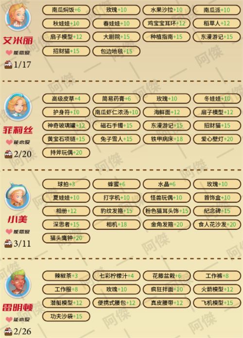 波西亚时光人物喜好是什么?要想提升NPC的好感度,就要了解所有NPC人物的喜好,根据喜好去送对的礼物就可以增加好感度,详细的人物喜好图我已经分享在下面,大家可以来参考下面的攻略了解一下。波西亚时光人物喜好图2022人物喜好文字版1、艾米丽非常喜欢:种植指南+15、冬漫游记+15、大剧院+15、招财猫+15、包边地毯+15、扇子模型+12、一串辣椒+12、一串