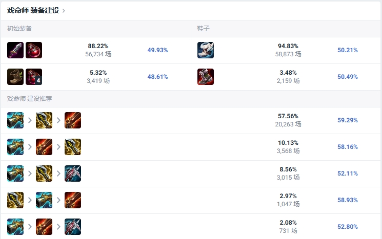 2024的LOL更新到了14.11版本,下路的ADC里,戏命师强度不低,有着14.66%的出场率,胜率49.88%,是T2的强度。这个英雄推荐主Q副W。第一件推荐出收集者增加斩杀能力,第二第三件要出无尽或者火炮,无论哪个先出都行。