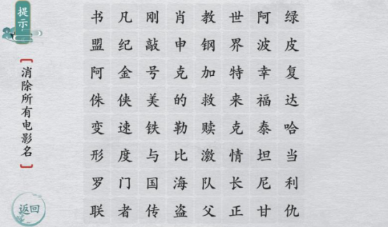 离谱的汉字消除所有电影名怎么过?消除所有电影名需要玩家在关卡中找到全部的电影名称,然后进行消除,全部消除完毕即可通关,这里我们可以先横着看有“书凡刚肖教世阿绿”“盟纪敲申钢界波皮”“阿金号克加特幸复”