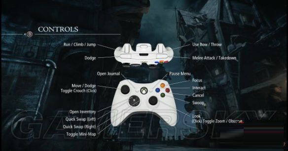 键位操作 LT键:奔跑 (佩戴攀山爪)攀爬 跳跃 LB键:躲闪 RT键:使用道具 投掷 RB键:近身攻击 放倒敌人 back键:打开日记(查看珍藏品、地图、等) 左摇杆:移动 躲避 摁下左摇杆:蹲下 十字键↑:打开物品栏(物品轮盘) 十字键←:快速使用物品栏标记为←的物品 十字键→:快速使用物品栏标