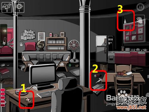 本关一开始不再是两个人物的对话,而只是男主角的自言自语。气氛还蛮紧张的样子。不过说话内容不牵涉到通关的要点,所以心急的同学可以跳过。之后就看到了房间的全貌。多点击一下发现可以拾取如下物品:两个八音盒娃娃碎片和一个强力胶。 想必稍微敏感一点的同学应该就能猜到,一定是要把这个娃娃修复好的。怎么修呢?拖开左边物品栏,选定第二项:合成物品 。