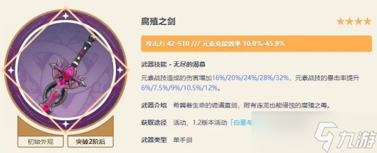 原神中有一类武器只能通过限时活动获取,错过机会就无法再得到,目前还没有出现重新推出的例子,可以称为“绝版武器”。截至4.7版本,已经出现了15种限定活动武器,让我们一起来看看吧。一、腐殖之剑-1.2版本活动武器原神15把绝版限定四星武器,有些不输五星,你拥有几把? " >这把武器的强度和泛用性还算不错,副词条是元素充能效率非常适合辅助和副C角色使用,比